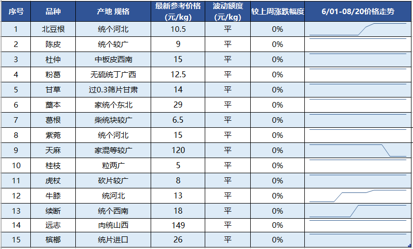 知母:春季受新货上市量大影响,价格也一路走低,此品生产周期长,在市场行情普涨背景下关注商也有所增多,近期行情也稳步上升,河北家种统片8月底参考价格21元/kg左右,环比上涨10.5%左右。