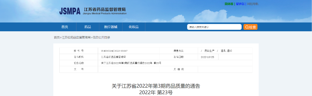 关于江苏省2022年第3期药品质量的通告