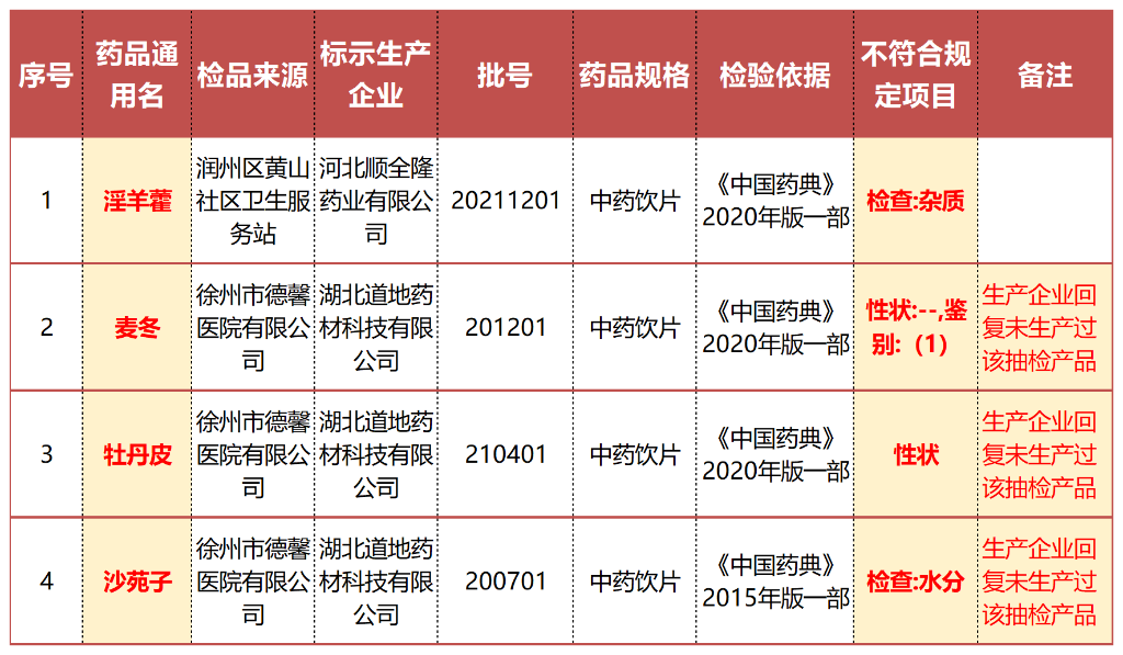 10月25日,江苏省药监局发布了《关于江苏省2022年第3期药品质量的通告(2022年 第23号)》,其中4批饮片抽检不合格:淫羊藿(检查:杂质),麦冬(性状:--,鉴别:(1)),牡丹皮(性状),沙苑子(检查:水分)。