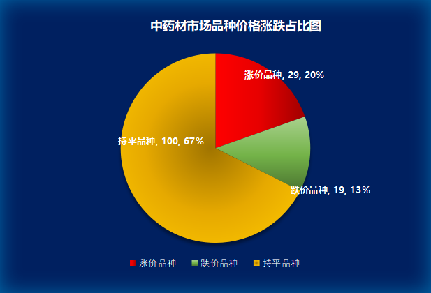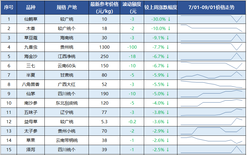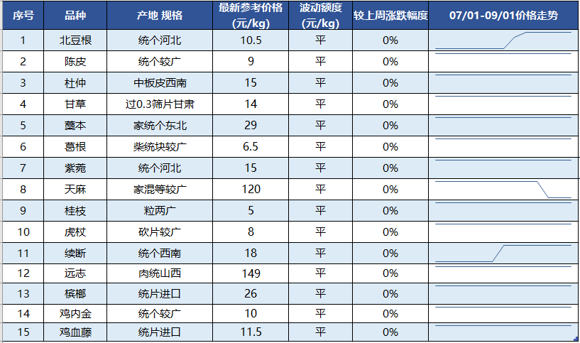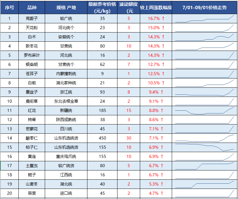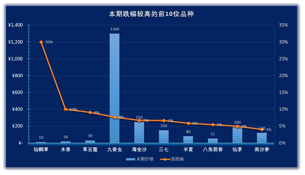 (2)本期共29个品种涨价,涨幅由高向低递减即茺蔚子、天花粉、白术、款冬花、罗布麻叶、银柴胡、苍耳子、白前、覆盆子等,下跌共计19个品种,跌幅由高向低递减即仙鹤草、木香、草豆蔻、九香虫、海金沙、三七、半夏等。另有100个品种与上期保持持平。