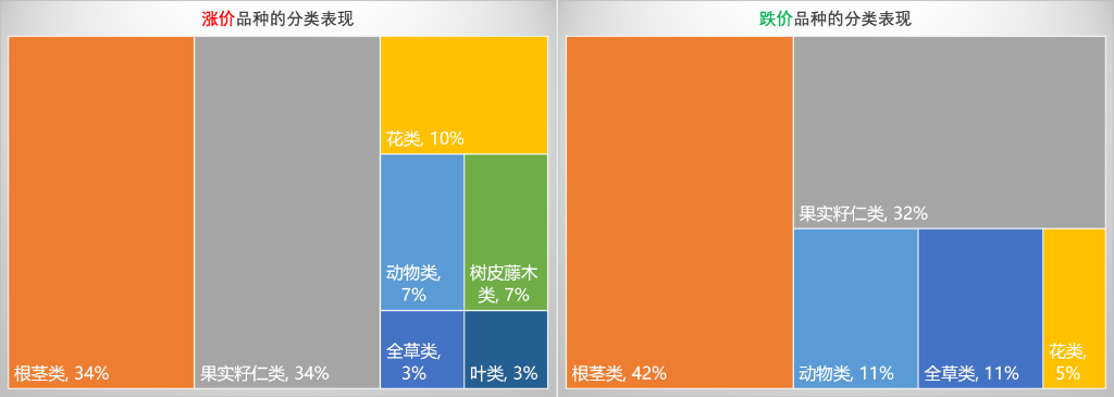 (1)本期上涨价品种共计29个,下跌品种共计19个,另有100品种与上期保持持平。价格上涨品种与下跌品种的数量比值小于2:1,其中涨价品种中果实籽仁类数量占比34%,如覆盆子、柏子仁、酸枣仁、茺蔚子等;跌价品种中根茎类药材数量占比42%, 如:半夏、南沙参、三七、太子参等。