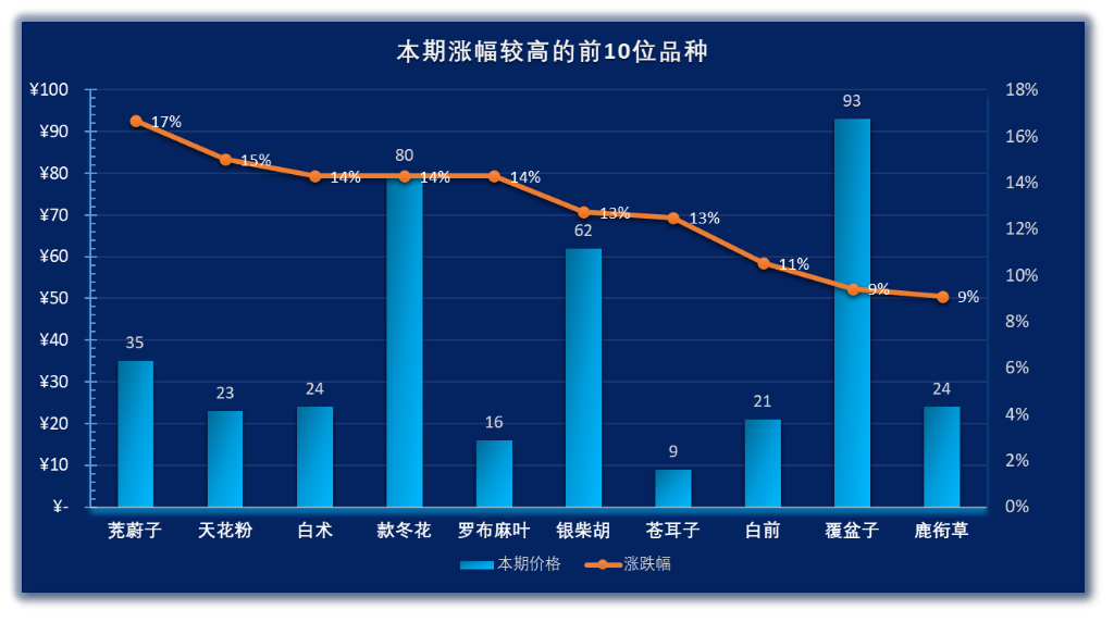 (1)本期价格行情上涨品种的前10位主要有:茺蔚子、天花粉、白术、款冬花、罗布麻叶、银柴胡、苍耳子、白前、覆盆子、鹿衔草等。