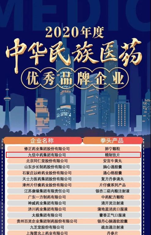 12月27日,“2020年度中华民族医药优秀品牌企业榜单”由全国工商联医药业商会隆重发布,九州通九信中药集团携旗下精制饮片产品荣登榜单。