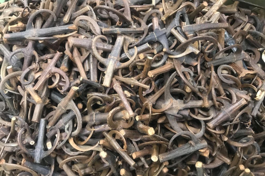 钩藤为茜草科植物钩藤、大叶钩藤、毛钩藤或无柄果钩藤的干燥带钩茎枝,主要产自湖南、贵州、四川、广西、江西等地,每年10月份开始产新,原本是以野生资源主供,近些年随着家种的发展,市场上的货源逐渐以家种为主。目前钩藤的行情平稳运行,含钩85%价格为66元/公斤,含钩90%价格为70元/公斤。