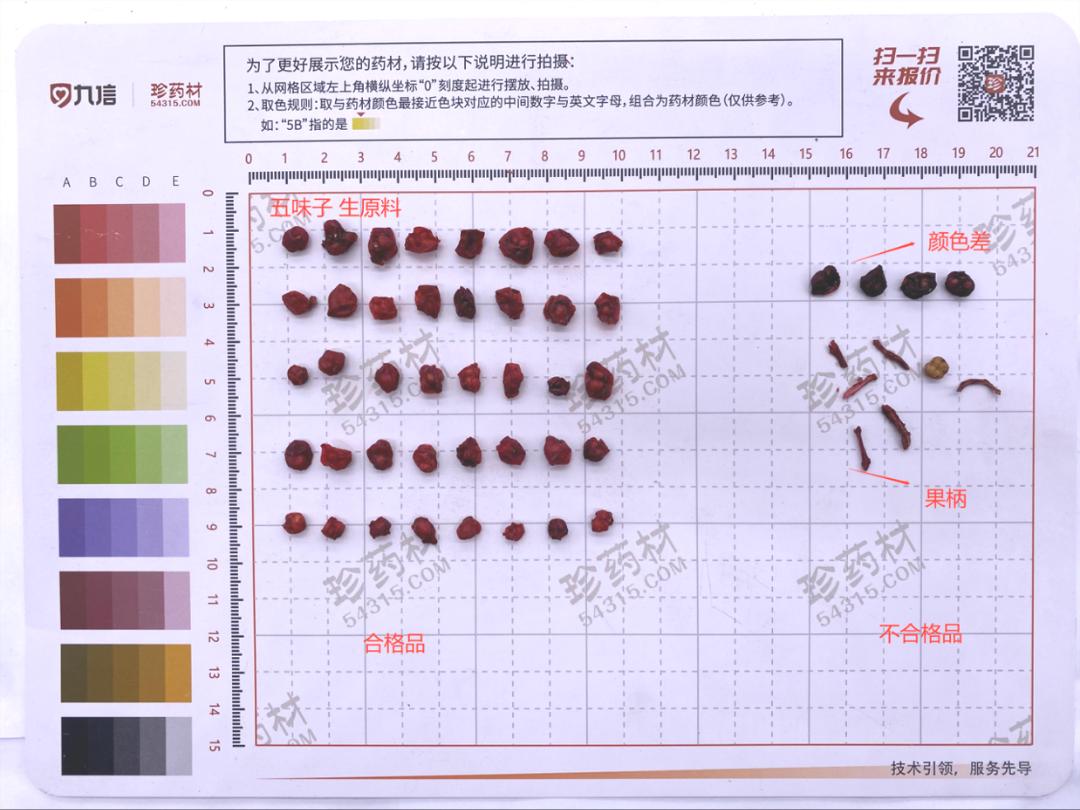 3000Kg质量要求:表面红色或黑红色;直径5~8mm,肉厚。无起霜霉变走油,果杆及杂质不超0.3%。过5mm方孔筛。内控标准:水分≤15%,灰分≤6%,SO2≤100mg/kg,五味子醇甲≥0.44%