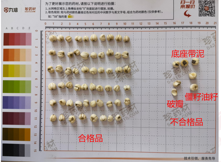 50000g质量要求:6-8mm颗粒松贝,松贝比例98%以上,不得含泥土、油粒,破粒及碎瓣不得过1%,无砂石,泥块,薄膜,绳头等杂质,无虫蛀、霉变、掺伪等情况,浸出物及含量高于药典10%