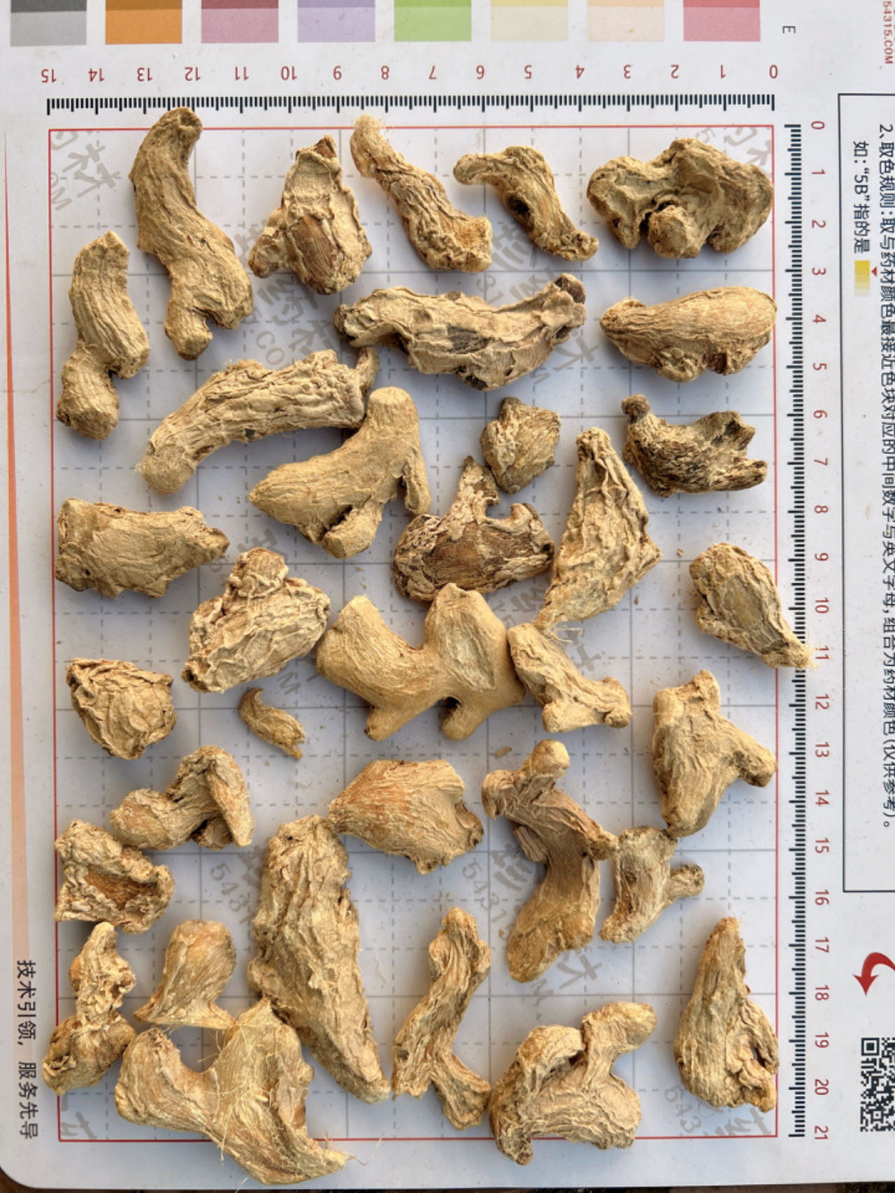 150Kg质量要求:个子货,长3~7cm,厚1~2cm,粉姜,个头饱满,颜色好,脱皮干净,过0.8mm方孔筛。内控标准:水分≤17.5%,灰分≤6.3%,SO2≤100mg/kg,浸出物≥24.0%,挥发油≥0.96%,6-姜辣素≥0.66%