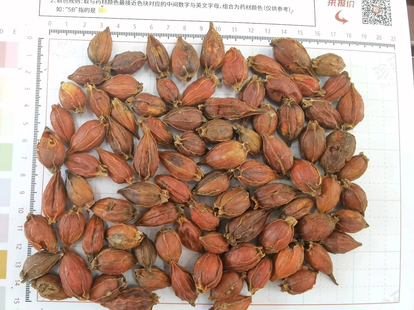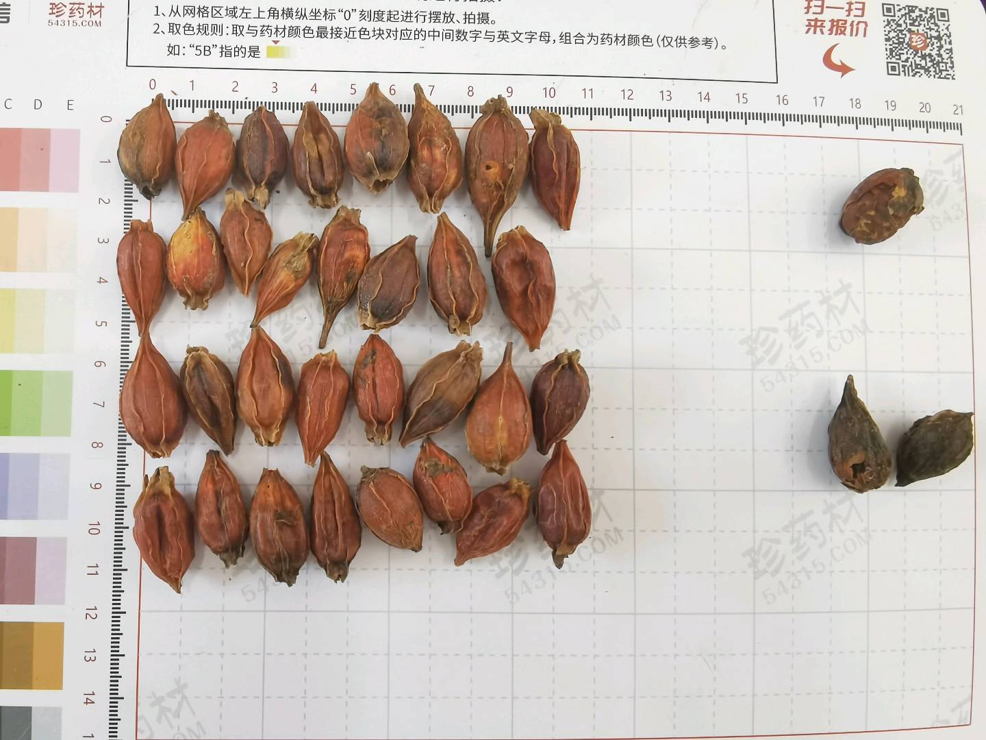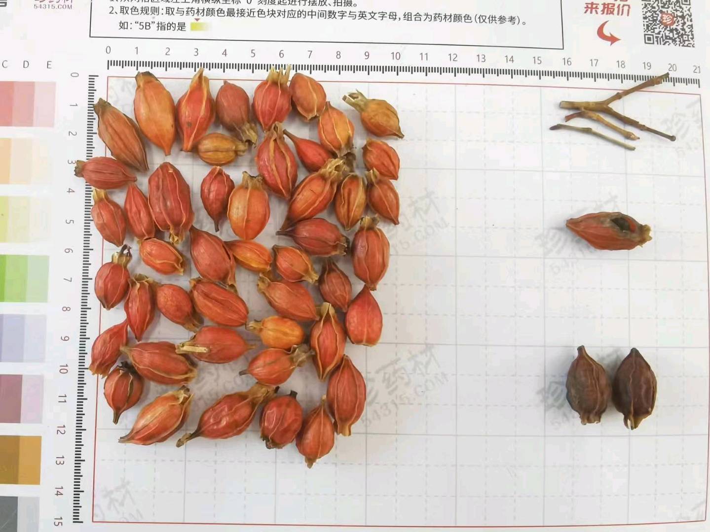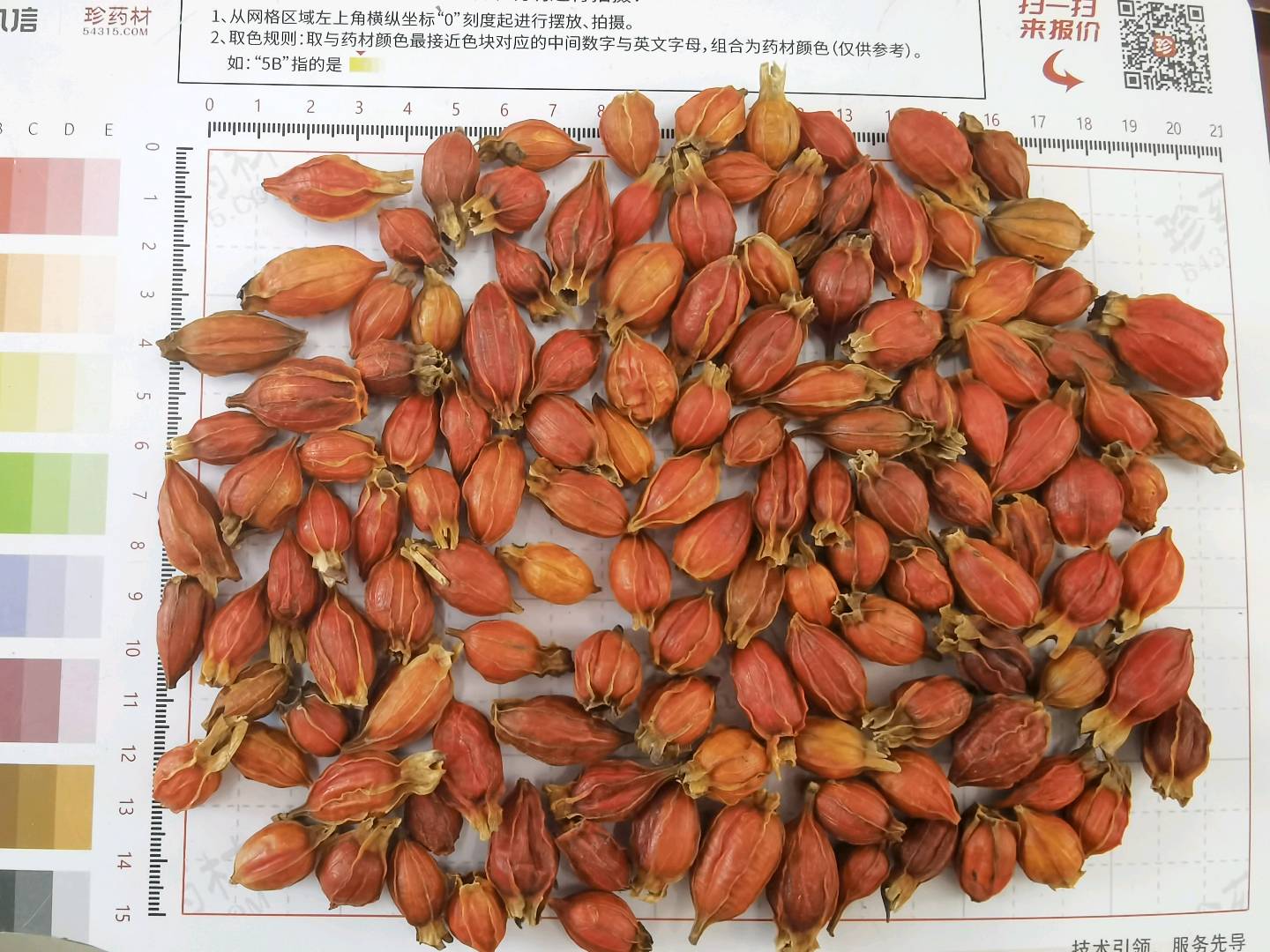 3000Kg质量要求:表面红黄色或棕红色,过10mm方孔筛,不得有烂果,萼片,枝梗等杂质不得过1.5%。水分≤8.0%,灰分≤5.0%,栀子苷≥1.9%。