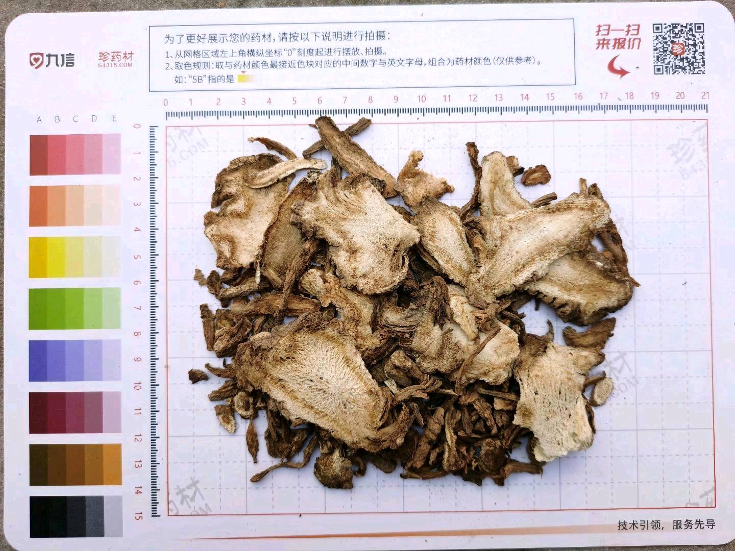 1500Kg质量要求:产地片,片厚1-2mm,厚度2mm以上不得过10%,过4mm方孔筛。无虫蛀,无发霉。除去须根,直径1.5~3cm,直径1.5cm以下不得过30%。内控标准:水分≤9.0%,灰分≤7.0%,酸灰≤1.8%,SO2≤100mg/kg,二氢欧山芹醇当归酸酯≥0.088%