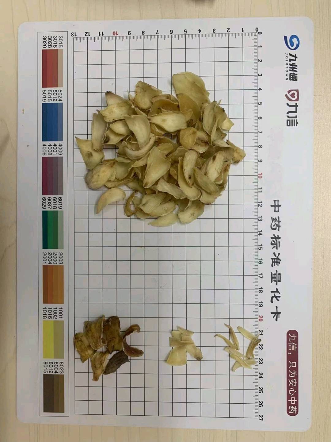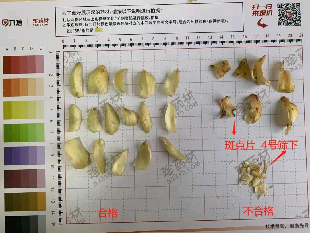 1320Kg质量要求:长2~5cm,宽1~2cm,中部厚1.3~4mm,4mm筛以下不得过2%,4mm方孔筛以上破瓣不得过6%;黄白色至淡黄色,颜色均一、无杂质,无黑片、无虫蛀。内控标准:水分≤12.0%,灰分≤4.5%,SO2≤100mg/kg,浸出物≥20.0%,含量≥23.1%