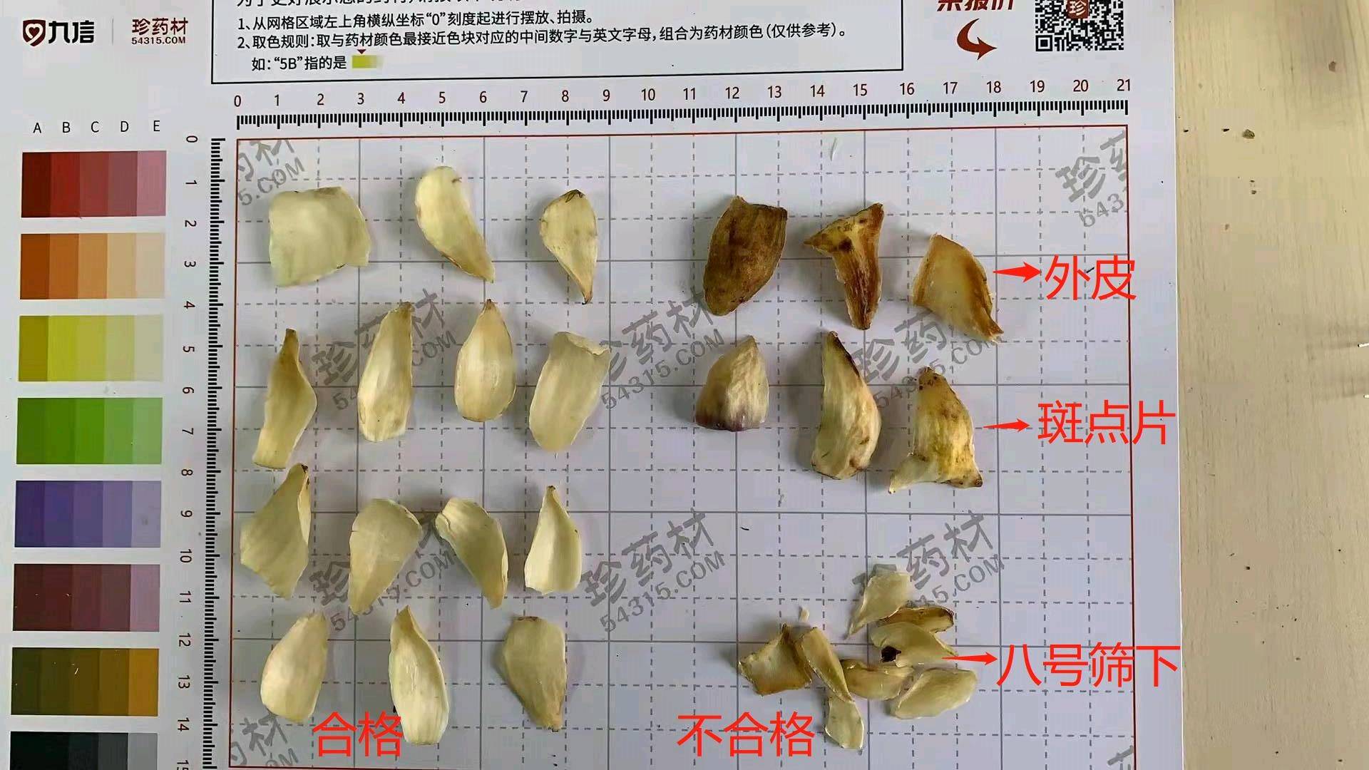 1200Kg质量要求:黄褐色的瓣和带黑色斑块的瓣占比不超过25%,过透4mm方孔筛,4mm方孔筛以上破瓣不超过8%。无其它编织袋线和烟头等异物。宽0.4~0.6cm不得过5%,1~1.2cm不少于20%,2~2.2cm不得过5%。内控标准:水分≤12.0%,灰分≤4.5%,SO2≤100mg/kg,浸出物≥20.0%,含量≥23.1%