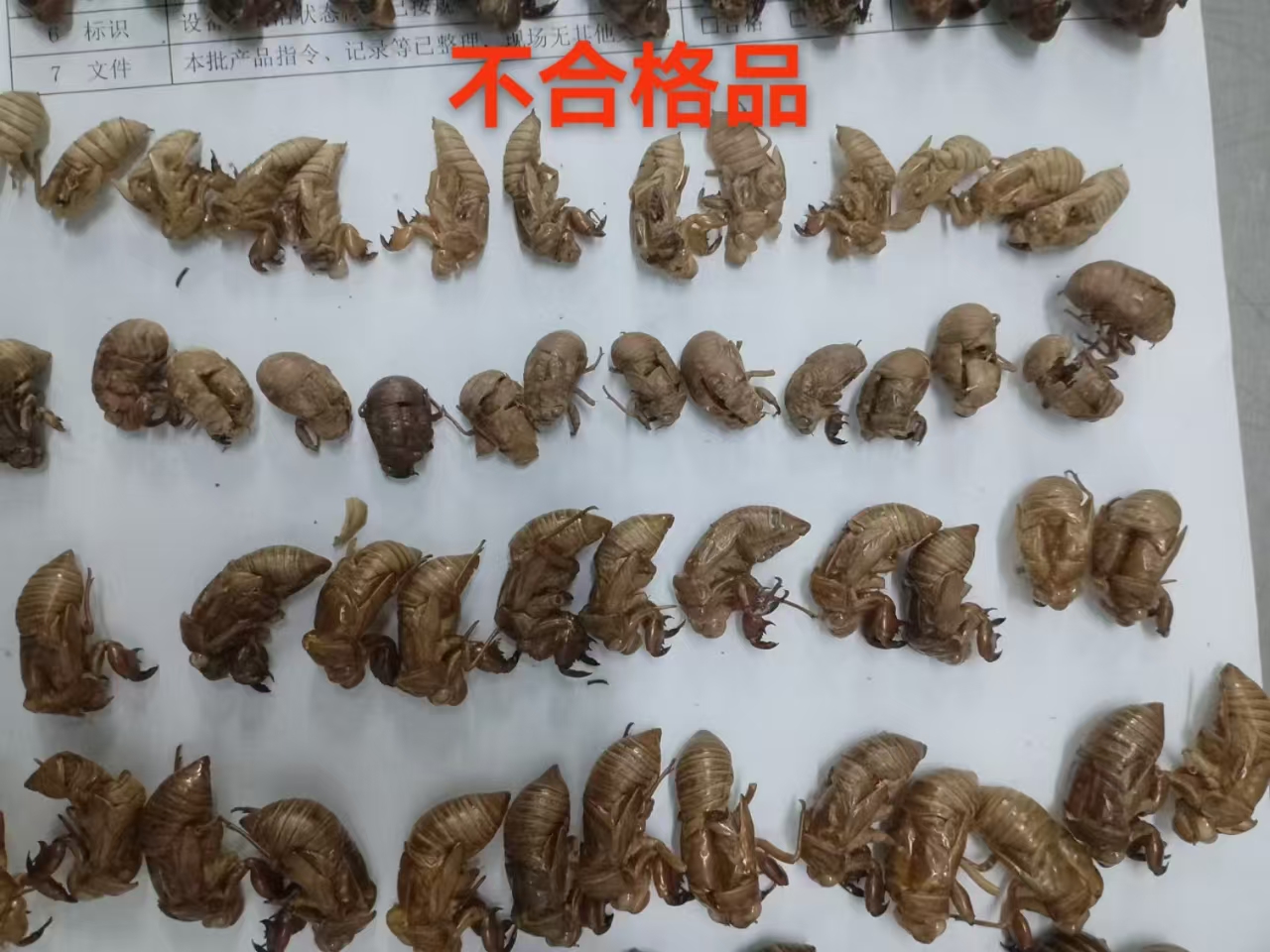510Kg质量要求:水洗2遍货,过1mm方孔筛以下碎腿不得过3.0%,长约3.5cm,宽约2cm,不要颜色发白货,无死蝉及伪品(蟪蛄、鸣蝉、金蝉)等。内控标准:水分≤12.0%,SO2≤100mg/kg
