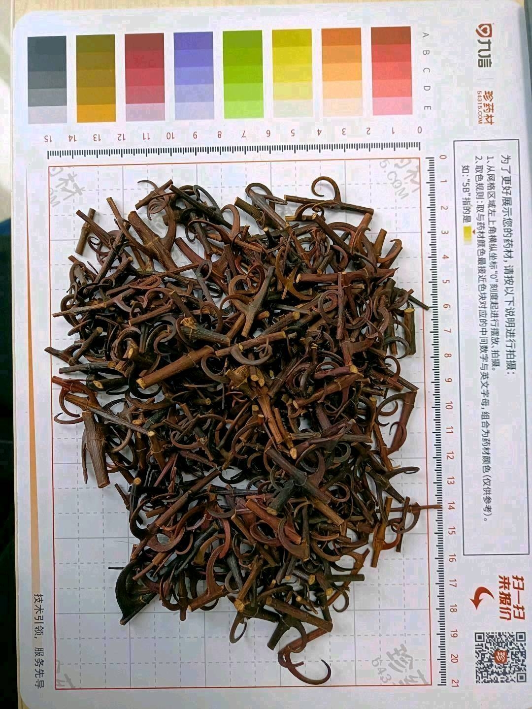 540Kg质量要求:茎枝呈圆柱形或类方柱形,长2~3cm,直径0.2~0.5cm,含钩率80%以上,老枝段不得过4%,3cm以上的段不得过3%,无灰屑、虫蛀、发霉,无塑料膜和编织袋线等杂质。内控标准:水分≤9.0%,灰分≤2.7%,SO2≤100mg/kg,浸出物≥7.0%