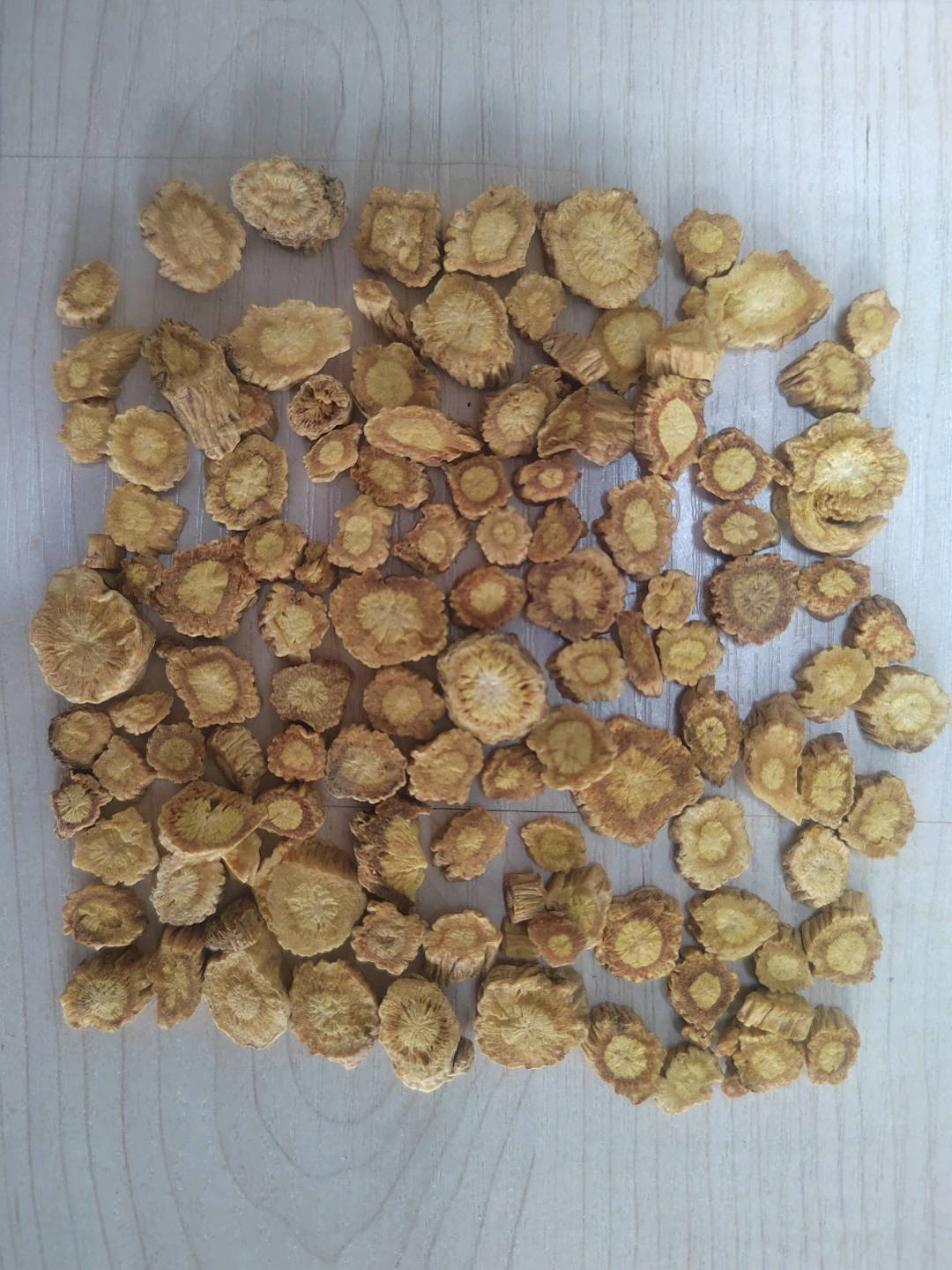4200Kg质量要求:趁鲜加工,过4mm筛,厚度2-4mm,去毛头,不得掺有甘肃货,走油片不得过3%,异形片不得过10%,直径0.5~2cm。内控标准:2025年药典标准,水分≤9.0%,灰分≤5.8%,酸灰≤1.3%,SO2≤100mg/kg,浸出物≥14.0%,含量≥0.055%,农残不得过药典标准的一半。