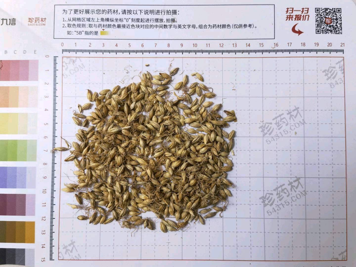 5000Kg质量要求:过12mm方孔筛,发芽率88%以上(剥开内外稃后,麦芽均可见),无异物,无虫蛀、发霉、掺伪等变质情况;水分≤12.5%,总灰分≤4.5%,黄曲霉符合药典要求,SO2≤80mg/kg。