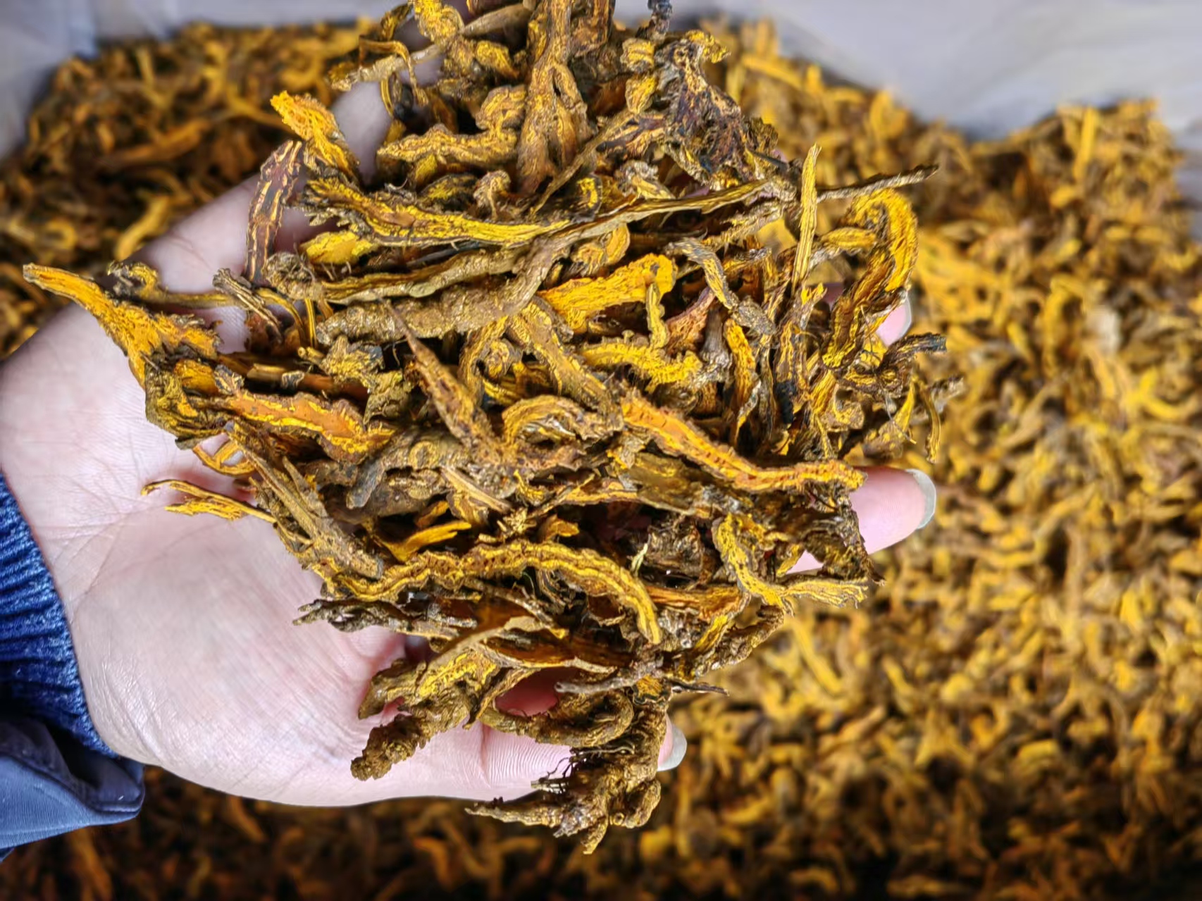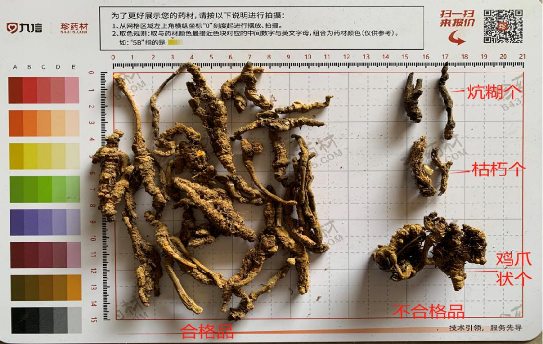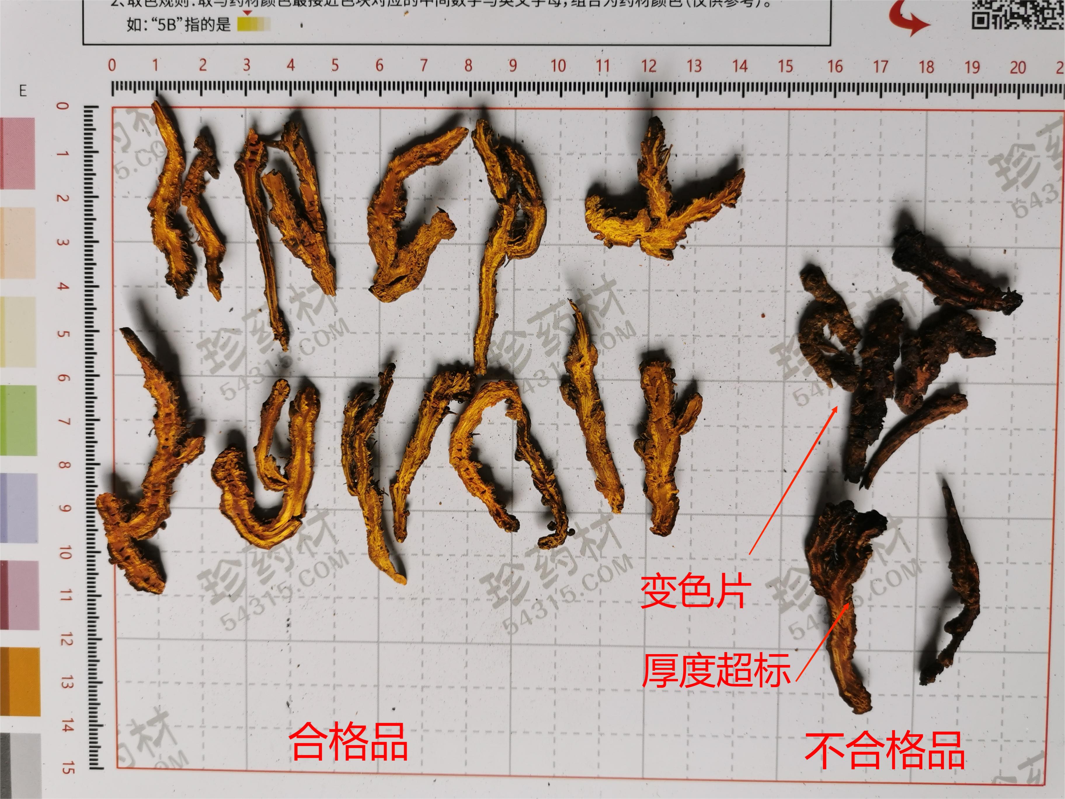 420Kg质量要求:假单支连,过2mm方孔筛,不超过3%,断面木部鲜黄色或橙黄色、皮部橙红色或暗棕色,直径大于0.3cm,不得有鸡爪状个(内含沙土)。内控标准:水分≤13.0%,灰分≤4.5%,SO2≤100mg/kg,浸出物≥16.5%,含量高于药典10%